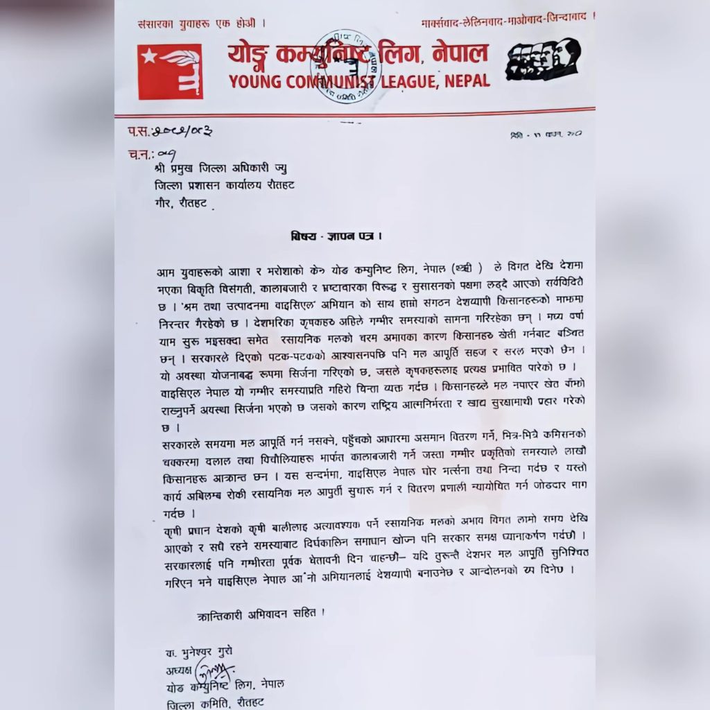 सरकारले समयमा मल आपूर्ति गर्न नसक्ने, पहुँचको आधारमा असमान वितरण गर्ने, भित्र-भित्रै कमिसनको चक्करमा दलाल तथा विचौलियाहरू मार्फत कालाबजारी गर्ने जस्ता गम्भीर प्रकृक्तिको समस्याले लाखौं किसानहरू आक्रान्त बनेको भन्दै वाइसिएल नेपालले घोर भर्त्सना गर्दै अबिलम्ब रसायनिक मल आपुर्ती सुचारू गर्न र वितरण प्रणाली न्यायोचित गर्न प्रजिअ मार्फत जोडदार माग गरेको छ । साथै मलखादको दिर्घकालिन समाधान खोज्न सरकारको ध्यानाकर्षण गराउदै आन्दोलन गर्न बाध्य नबनाउन वाईसीएलले ज्ञापनपत्र मार्फत चेतावनी दिएको छ ।