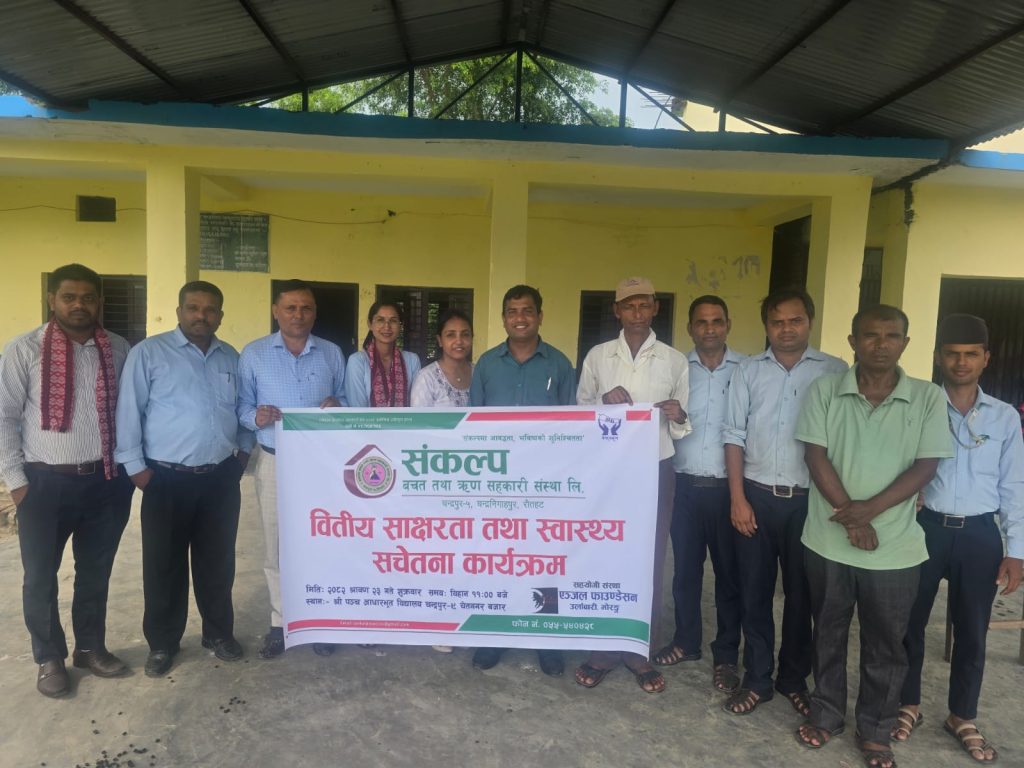 चन्द्रपुर । संकल्प बचत तथा ऋण सहकारी संस्था लिमिटेडको आयोजना तथा एन्जल फाउन्डेसन शाखा कार्यलय डुमरवाना बाराको प्रविधिक सहयोगमा बित्तीय साक्षरता तथा स्वास्थ सचेतना कार्यक्रम आयोजना गरिएको छ। वित्तीय सचेतना सहकारी शिक्षा लगायतका विषयहरुमा सचेतना प्रदान गर्ने तथा स्वस्थ्य सम्बन्धी जिज्ञासाहरुको समाधान तथा रोग पहिचान गर्ने उद्देश्यले आयोजना गरीएको कार्यक्रमको अध्यक्षता संस्थाका अध्यक्ष गणेश पौडेलले गरेका थिए ।