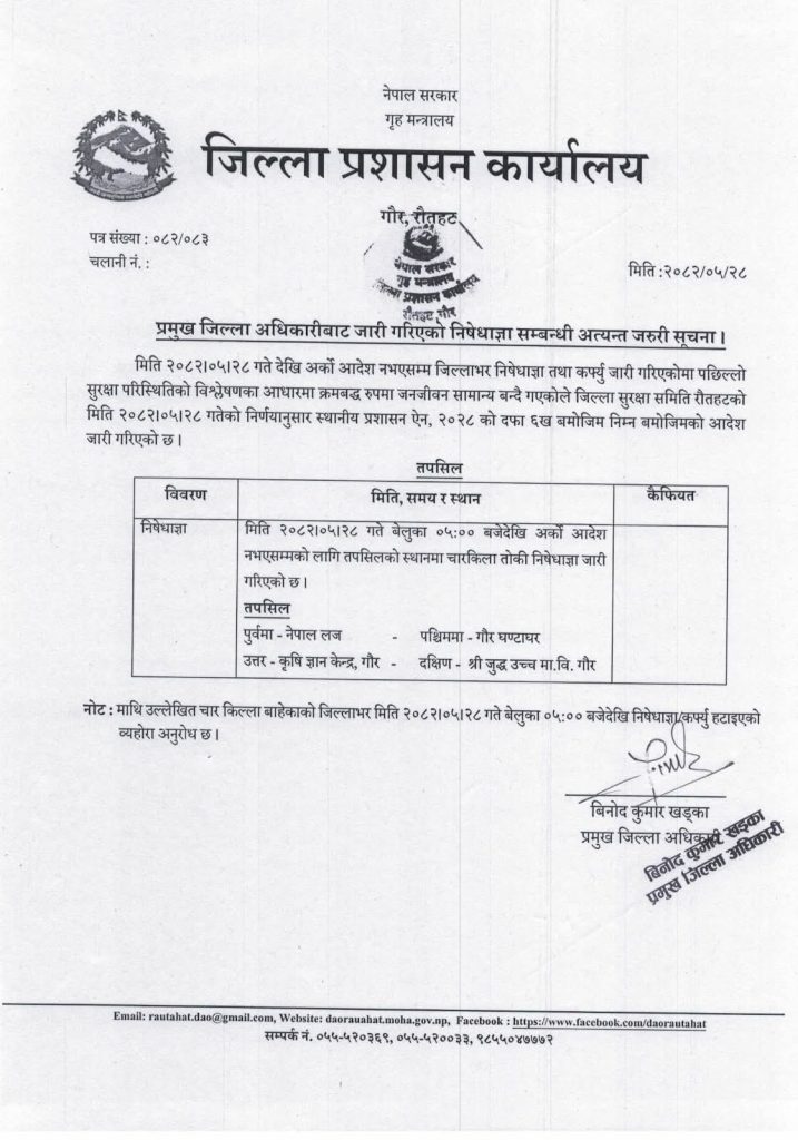 प्रशासनले गौरको केही भागमा भने निषेधाज्ञा र कर्फ्यु जारी रहने भन्दै पुर्वमा नेपाल लज,उत्तरमा कृषि ज्ञान केन्द्र,पश्चिममा गौर घण्टाघर र दक्षिणमा श्री जुद्ध उच्च मा.वि. गौरलाई सिमाना तोक्दै सो स्थानहरुमा निषेधाज्ञा र कर्फ्यु यथावत राखेको छ ।