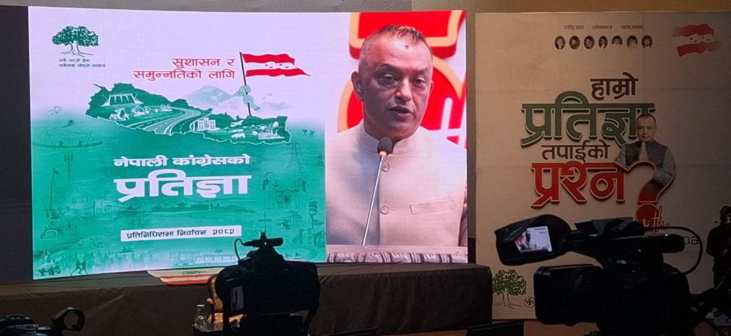 काठमाडौं। नेपाली कांग्रेसले प्रतिनिधि सभा निर्वाचन २०८२ लाई लक्षित गर्दै ल्याएको प्रतिज्ञा पत्रमा सुशासनलाई प्राथमिकतामा राखेको छ।