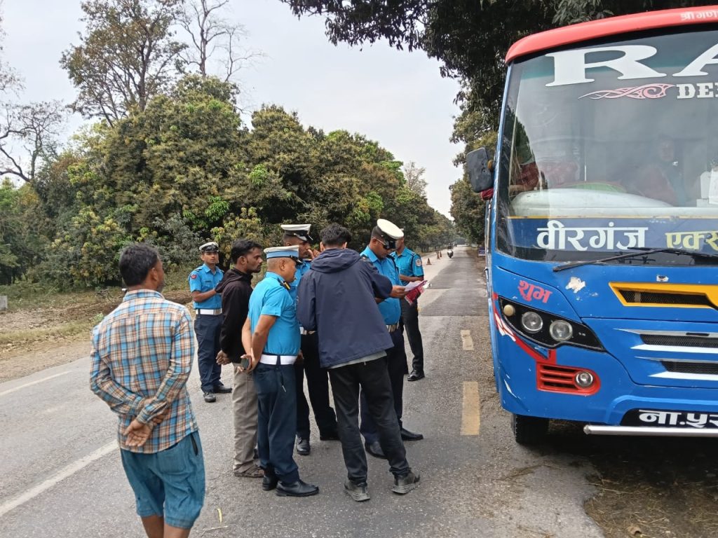 जिल्ला ट्राफिक प्रहरी कार्यालय, चन्द्रनिगाहपुर रौतहट र यातायात व्यवस्था कार्यालय गौर, रौतहटको संयुक्त आयोजनामा ट्राफिक कार्यालयका प्रमुख,प्रहरी निरीक्षक राजेन्द्र थापा मगरको कमाण्डमा ७ जना र यातायात व्यवास्था कार्यालय, गौर रौतहटका मेकानिकल सुपरभाईजर अनिष साह लगायतको प्राविधिक टोलीले सनिबार पुर्व-पश्चिम महेन्द्र राजमार्गमा चेकजाँच सुरु गरेको छ ।
