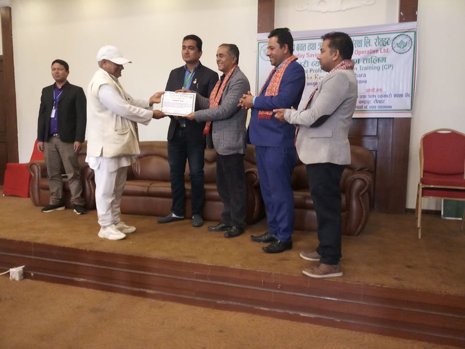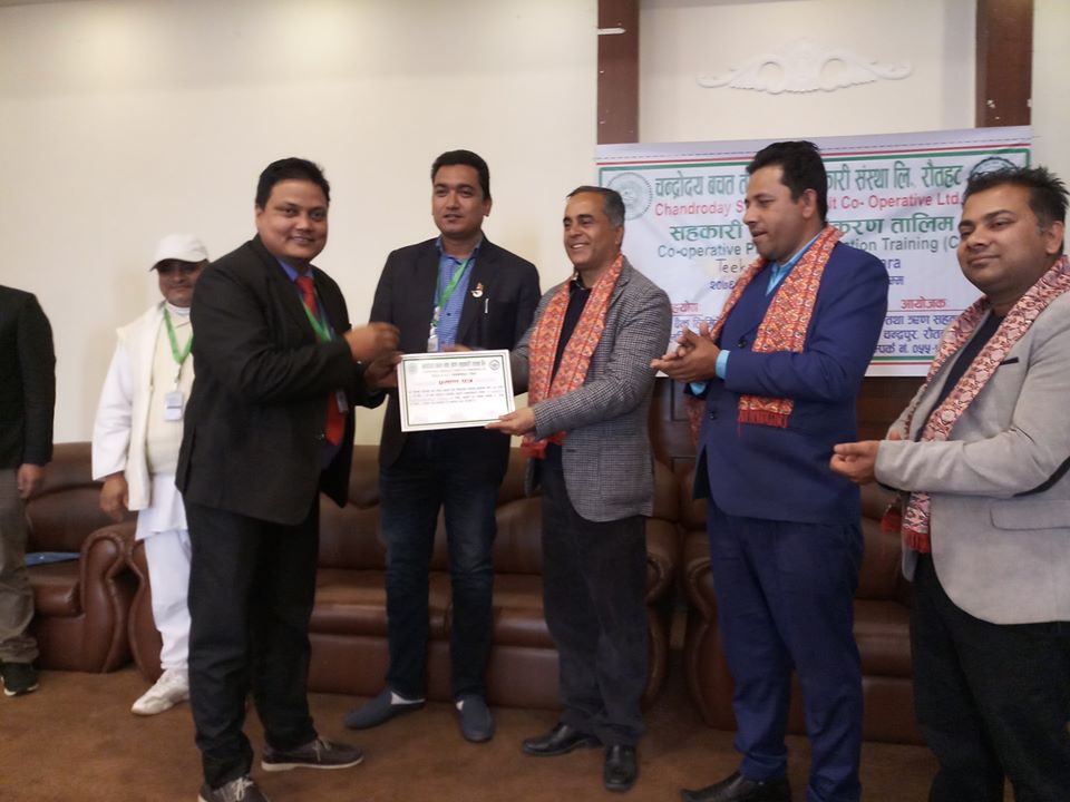 साथै कार्यत्रमका प्रमुख अतिथि,बिशिस्ट अतिथी, प्रशिक्षक सुर्य रिमाल, होटल टिका रिर्साेटका संचालक अतिथीहरु र समपुर्ण सहभागीलाई चन्द्रोदय साकोसका अध्यक्ष को हातबाट प्रमाण पत्र वितरण गरिएको थियो ।