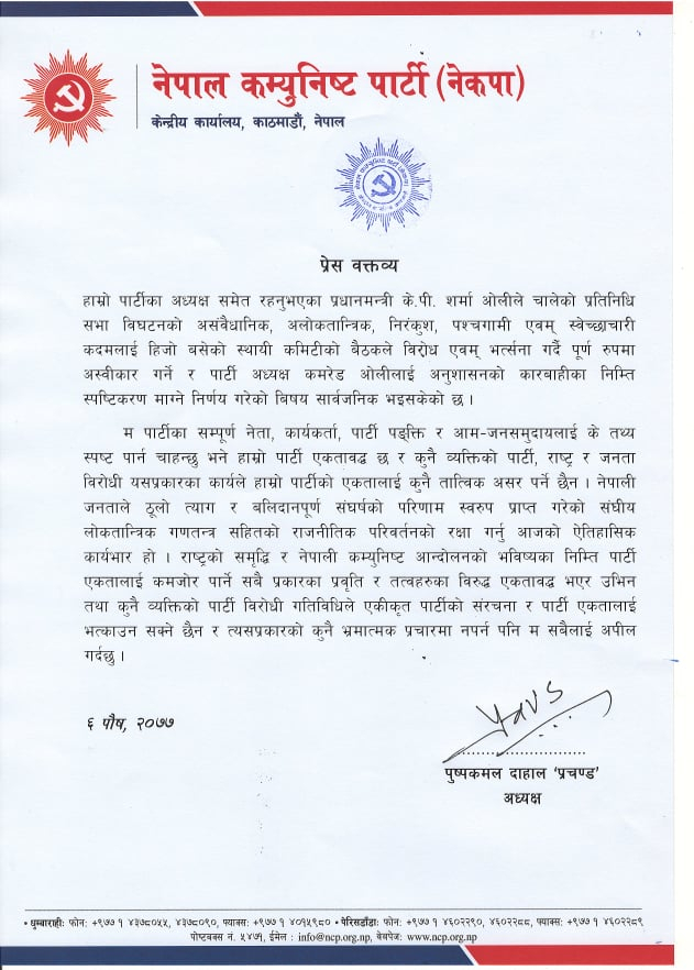 दाहालले सोमबार बिहान विज्ञप्ति जारी गर्दै कुनै व्यक्तिको पार्टीविरोधी गतिविधिले एकीकृत पार्टीको संरचना र पार्टी एकतालाई भत्काउन नसक्ने उल्लेख गरेका छन् ।