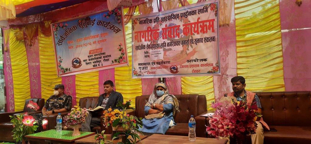 गुजरा । नागरिक प्रती उत्तरदायीत्व प्रबर्द्धनका लागि नागरिक सम्बाद कार्यक्रम शुक्रबार गुजरामा सम्पन्न भएको छ । जिल्ला प्रशासन कार्यालय रौतहटको आयोजना र गुजरा नगरपालिकाको ब्यवस्थापन तथा सहजीकरणमा १ दिने सार्वजनिक सुनुवाइ,नागरिक सम्बाद कार्यक्रम सम्पन्न भएको हो । कार्यक्रममा नेपाली काङ्रेसका नगर सभापति कुमार चौलागाईंले समयको ख्याल नगरी काम गर्ने,जनताको गुनासो सुनेर काम कार्बाही गरिनुपर्ने बताउनुभयो। गुजरा नगरपालिकामा पैसाको लेनदेनमा वडाका प्रतिनिधीहरुले उपभोक्ता समिती मार्फत काम हुने गरेको आरोप उहाले लगाउनुभयो । न्यायीक समितिको काम प्रभावकारी नभएको गुनासो गर्दै बिकाश साझा हुने भएकाले बिकासमा राजनीति गर्न नहुने धारणा राख्नु भयो ।